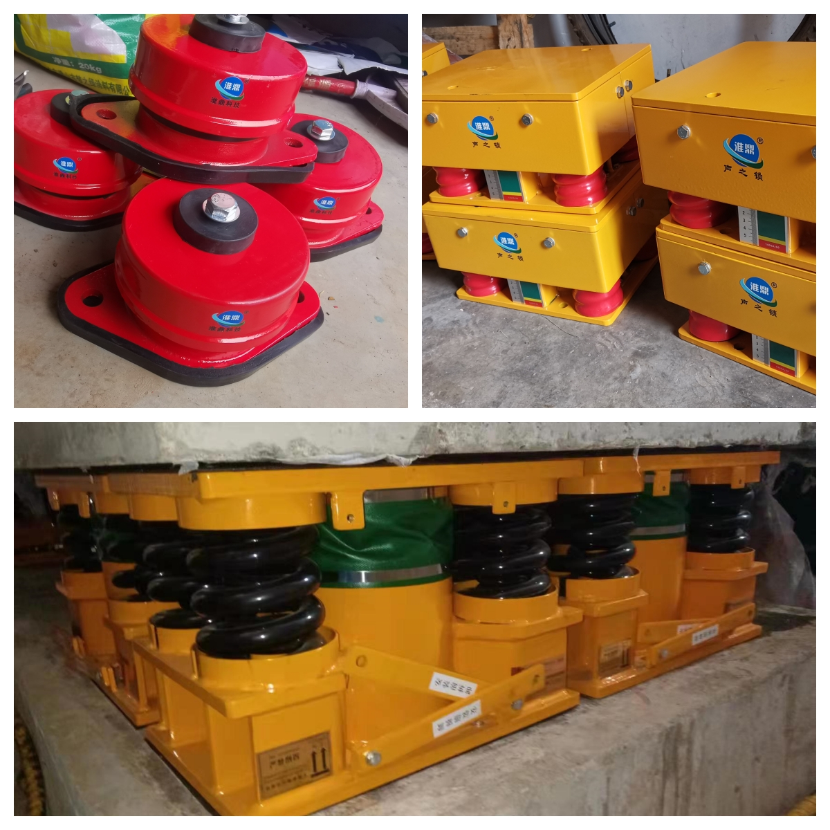 隔振器:頻率低于 6Hz的低頻靜音減振器。可選大撓度(不低于 50mm)低頻彈簧減振器配合天然膠墊安裝或者加裝空氣彈簧減振器。因是改造項目,彈簧減振器高度過大,不適合安裝,所以設計安裝超低頻靜音系列的空氣彈簧減振器、橡膠減震器、部分鋼彈簧減震器等其他減振產(chǎn)品配合使用。隔振降噪原理:空氣是振動和噪音的不良導體,用隔振手段把設備與樓板隔離開,由剛性連接轉(zhuǎn)換成軟性連接,中斷振動傳播途徑。 設計隔振效率:90%。 隔振效果:安裝后整個隔振體系的自振頻率達到 3Hz以下,低頻振動及因低頻振動產(chǎn)生的噪音基本消除。